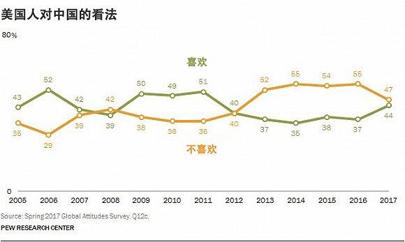 中国国家主席习近平和美国总统特朗普即将于本周晚些时候在后者位于佛罗里达州的海湖庄园(Mar-a-Lago)会晤,商讨包括贸易、领土争端以及朝鲜核项目在内的棘手问题。 这些问题也是美国普通民众所关心的,特别是中美两国间的经济关系问题。而最新调查则显示,近期美国人对中国的好感度有所改善。 皮尤研究中心(Pew Research Center)周二(4月4日)发布的一项调查显示,44%的美国人对中国持有好感,高于一年前的37%。对中国持负面态度的美国人占比也从去年的55%降至了47%。
