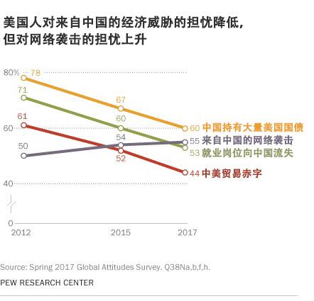 报告指出,好感度的改善部分可能因为对来自中国的经济威胁的担忧有所减轻。 近年来,认为中国所持美国国债、就业岗位向中国流失,以及和中国的贸易赤字是非常严重问题的美国公众占比明显下降。例如,在2012年,有61%的美国人认为贸易赤字是个很严重的问题,而今天的这一比例只有44%。 不过,对中国网络袭击的担忧有所上升,认为该问题比较严重的美国人占比从五年前的50%升至现在的55%。 美国人对中国好感度的增加,另一个原因也可能与他们对美国经济状况的乐观情绪大幅增强有关。58%的美国人认为,美国现在的经济状况很好或者不错,2016和2015年的这一数据分别是44%和40%。 不过,债务、贸易和就业问题依然是美国人的担忧来源,超过一半(52%)的美国人认为,中国更多是经济威胁,而非军事威胁。 调查显示,将中国主要视作军事威胁的美国人占比略高于三分之一(36%)。如果有日本、韩国或菲律宾等亚洲盟友卷入和中国的军事纷争,大部分美国人(58%)将支持使用武力对抗中国。