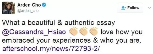 萧靖彤在接受BBC采访时说: 对身份认同感和归属感的渴望和挣扎是最能让人产生共鸣的东西。我想和他人分享我的家庭生活的一个侧面,我和母亲的感情和我们俩的经历。 说到自己的母亲,萧靖彤饱含深情: 我母亲是我的榜样,她让我脚踏实地,她激励我不光要有梦想,还要采取实际行动让梦想成真。我爱她对生活的热情、她的勇敢、她的悲悯和她的诚实。 这篇优秀的申请作文让萧靖彤脱颖而出,也让她立刻成了网红。许多网友都表达了对她的喜爱。
