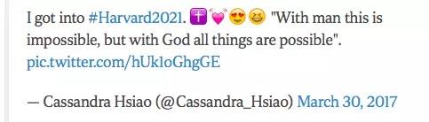 现在,问题来了,这么多名校给你选,选哪个呢? 真是甜蜜的忧伤啊。 萧靖彤从小就很喜欢哈佛大学,曾在7年级时去哈佛大学参观。在收到哈佛的录取通知书后,萧靖彤激动得马上发了一条推特: