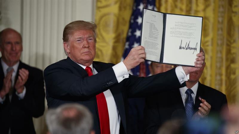 川普总统在白宫举行的国家太空委员会会议期间签署《太空政策指令》。(2018年6月18日)