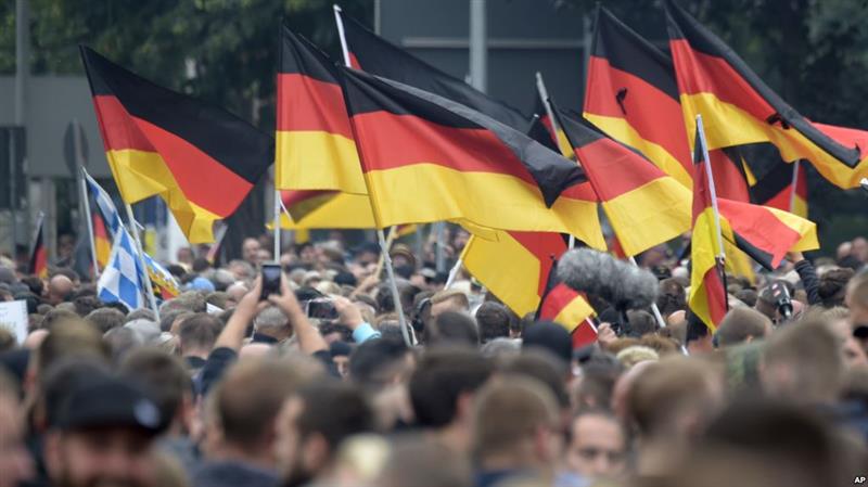2018年9月1日,示威者在德国东部开姆尼茨的集会上高举德国国旗。