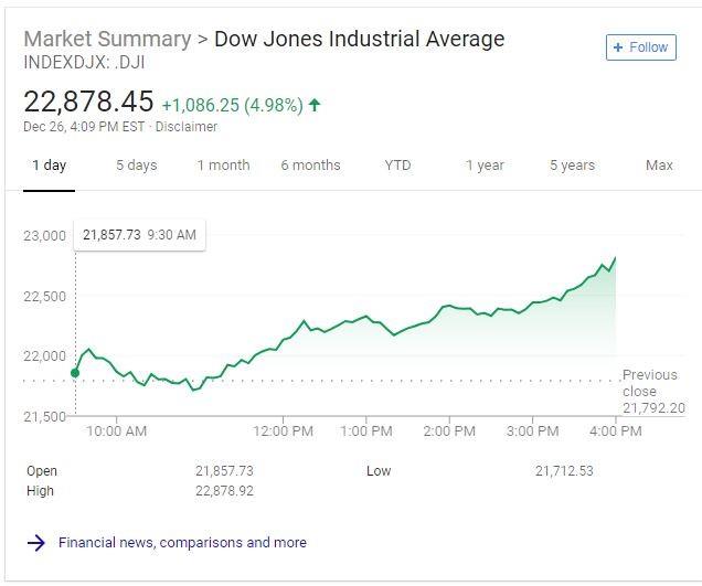 据CNN等综合报道 为稳定市场情绪,美财长姆努钦圣诞节前紧急召开金融监管高层会议,反让投资人更加紧张,美股经历“最惨平安夜”,三大股指均下跌逾2%。有消息称姆努钦可能职位不保,总统对于他办事不力的沮丧情绪暴增。但在周三,股市经历四个交易日大幅下挫后迎来反弹,道指更暴涨逾1000点,破历史记录。 圣诞节后,股市正试图从节前灾难性的暴跌中反弹。标准普尔500指数在四个交易日大幅下挫后距离进入熊市只有咫尺之遥。如果它收低7点,将结束历史上最长的牛市。所幸的是,投资者尚未放弃牛市。周三开盘标准普尔500指数上涨0.2%,纳斯达克指数上涨约0.9%。午盘时,道琼斯攀升500点或2.3%至22303,标准普尔500指数上涨2.4%,纳斯达克综合指数上涨3.1%。标准普尔500指数中的所有11个板块均获得上涨。
