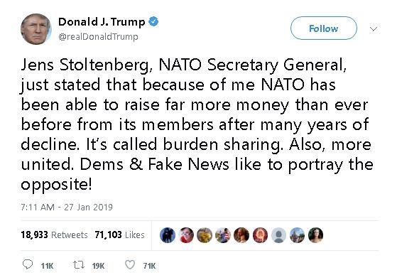 川普推特截图。 就在在斯托尔滕贝格作出此番言论后不久,川普在推特上重新强调了这位北约组织领导人的发言。 “北约秘书长延斯斯托尔滕贝格刚刚表示,由于我的原因,在经过多年的衰退之后,北约已经能够从其成员那里筹集到比以往更多的钱”,川普在推特上说,“这被称为分担预算。而且,更加团结。民主党和假新闻喜欢描绘相反的情况!”