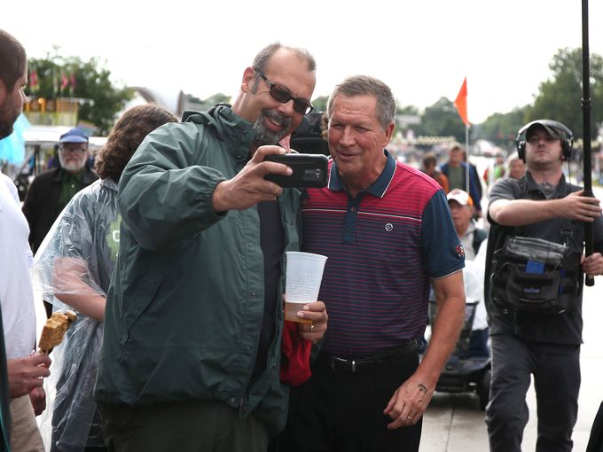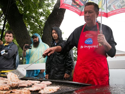 Kasich astonished reporters during a tour of the Iowa State Fair Tuesday afternoon by eating three pork chops, a side order of beans, and then purchasing an ear of roasted corn on the cob at a fair booth. When asked about it afterward, he pointed to his slender build and joked that he still hoped to have some ice cream before he left the fair.